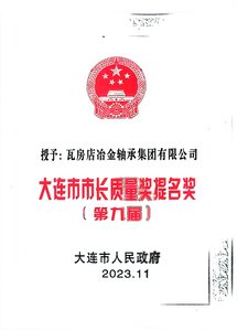 喜訊!瓦冶軸獲大連市市長質量獎提名獎